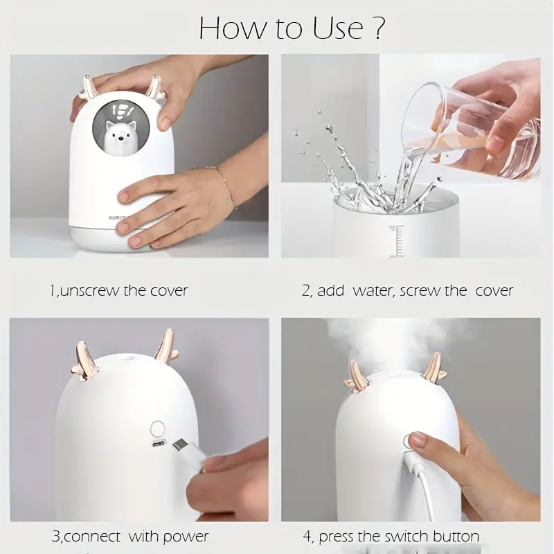 Mini Humidifier Air Diffuser Aroma Oil Diffuser. Δεξαμενή νερού 300 ml. με πολύχρωμο νυχτερινό φως. Δύο τρόποι ψεκασμού είναι ρυθμιζόμενοι, μία φορά πιέστε για συνεχή ψεκασμό και δύο φορές για διαλειμματικό ψεκασμό. Τροφοδοτείται 5V 1A micro USB, συμβατή με οποιαδήποτε συσκευή με θύρα USB όπως φορητό υπολογιστή, επιτραπέζιο υπολογιστή, power bank, πρίζα ή πρίζα. Λειτουργία αυτόματης απενεργοποίησης, Μικρό και ελαφρύ, ιδανικό για υπνοδωμάτιο στο σπίτι, γραφείο σε 20-30 τετραγωνικά μέτρα ή φορητό για αυτοκίνητο, ταξίδια.