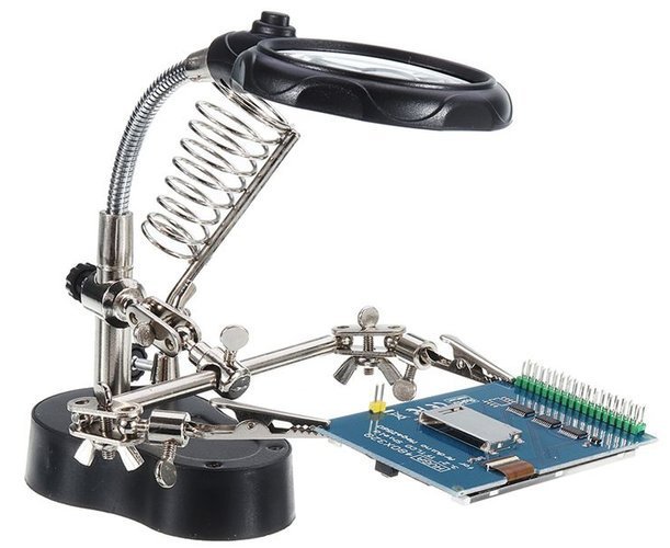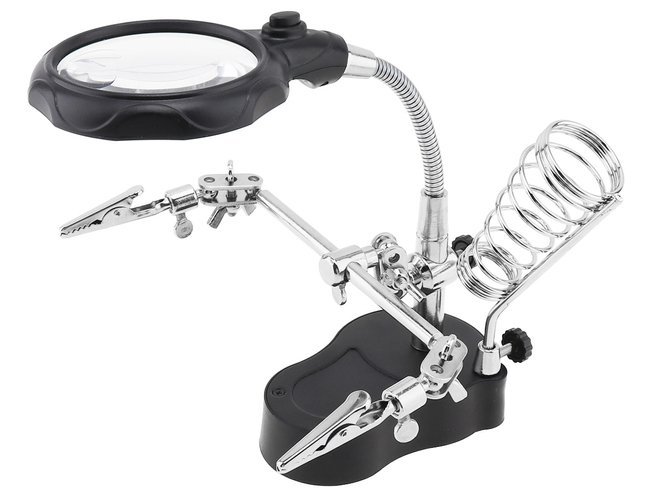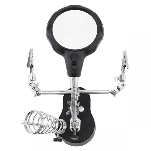 Εργαλείο, στήριγμα συγκόλλησης «Τρίτο Χέρι». Φακοί μεγέθυνσης 3.5x + 12x, LED, λαβές & βραχίονες. ABS + ανοξείδωτο ατσάλι