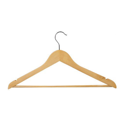 Η ελαφρώς καμπυλωτή εργονομική σχεδίαση βοηθά στη διατήρηση της φόρμας των ρούχων, ενώ οι αυλακώσεις στους ώμους εμποδίζουν την ολίσθηση τιραντών ή ευαίσθητων υφασμάτων. Η στρογγυλή ξύλινη μπάρα στο κάτω μέρος επιτρέπει την τακτοποίηση παντελονιών, φουλαριών ή γραβατών, εξοικονομώντας χώρο.