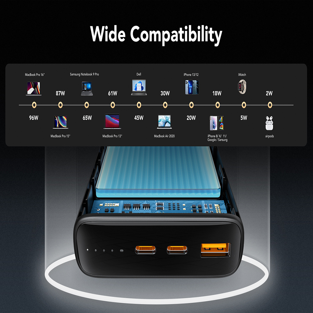 Με μια θύρα USB-C 100W, μια θύρα USB-C 20W και μια θύρα QC3.0 18W, αυτό το power bank μπορεί να φορτίσει έως και 3 συσκευές ταυτόχρονα.