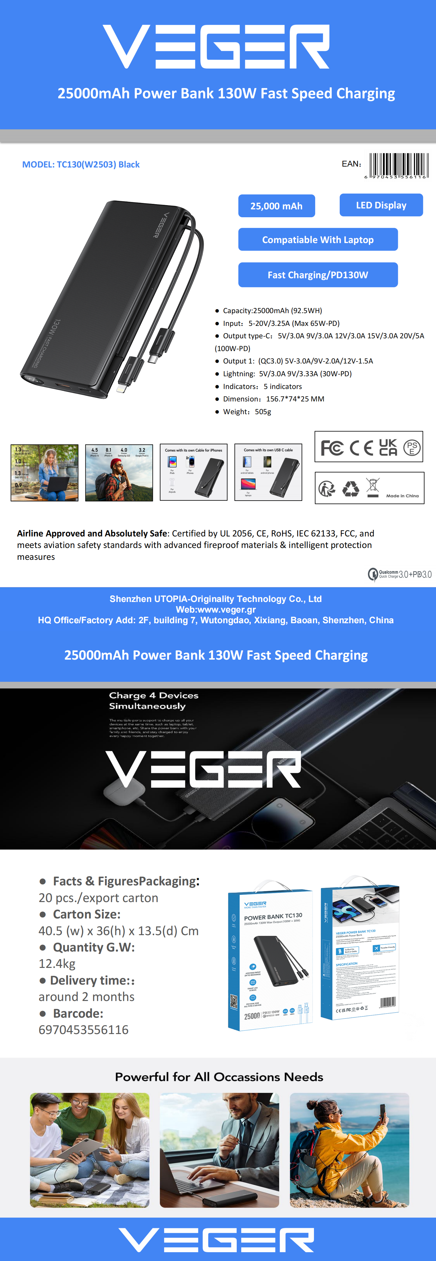 Veger TC130 Power Bank 25000mAh 130W με Θύρα USB-A και Θύρα USB-C Power Delivery Μαύρο