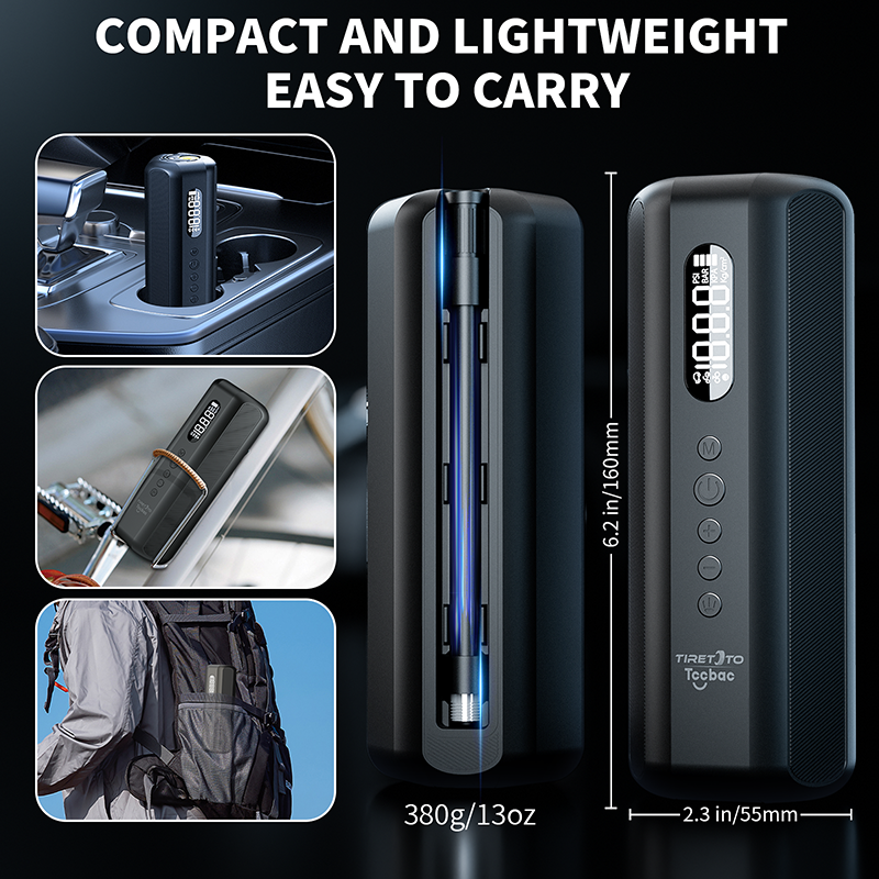 - Lightweight and Portable Our mini car tire inflator has a lightweight design, easy to carry and store, can be easily put in the car trunk, luggage rack or locker, inflate your bike, motorcycle, car or ball at any time. Note: For cars, we recommend using it to inflate