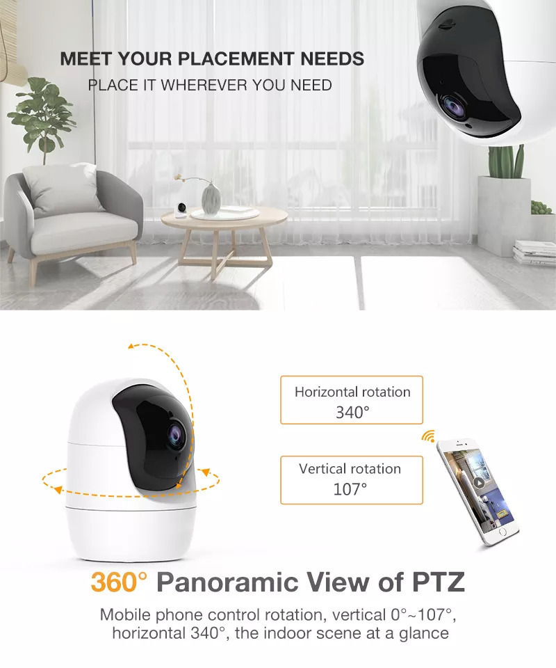 Η κάμερα ασφαλείας είναι ψηφιακή (IP), συνδέεται στο δίκτυο σας ασύρματα μέσω Wi-Fi και τοποθετείται σε επίπεδες επιφάνειες. Μπορείτε ακόμη μέσω εφαρμογής στο smartphone κινητό σας, να χειριστείτε την κάμερα και να παρακολουθήσετε live την περιοχή λήψης που επιθυμείτε. Με την λειτουργία PTZ (Pan-Tilt-Zoom), μπορείτε να ζουμάρετε στην περιοχή που θέλετε και να περιστρέψετε την κάμερα κάθετα ή οριζόντια. Τέλος, είναι εφοδιασμένη με φώτα led υπερύθρων έτσι ώστε να είναι δυνατή η καταγραφή της εικόνας σε απόλυτο σκοτάδι.